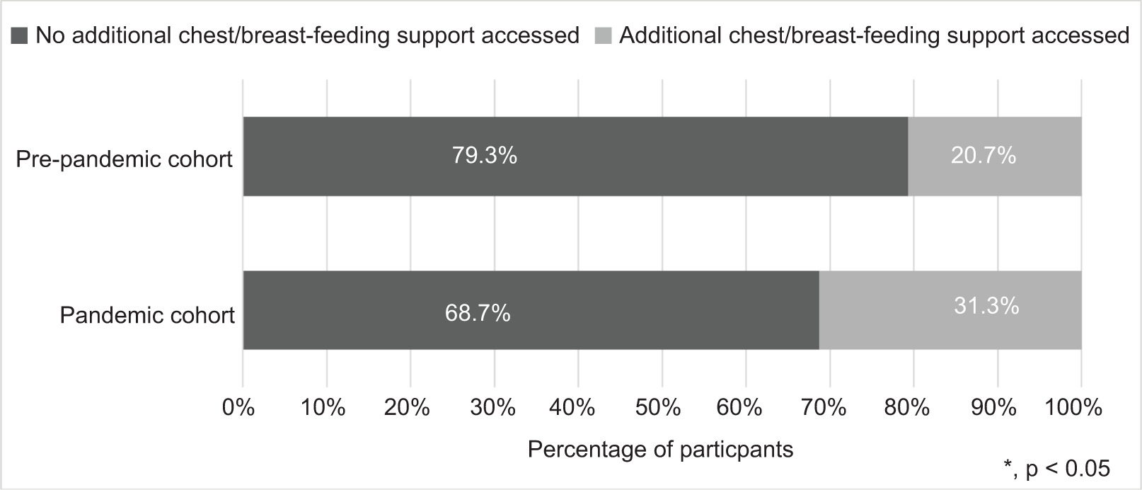 Figure 2. Comparison of additional chest/breastfeeding support accessed among the pre-pandemic and pandemic cohorts.