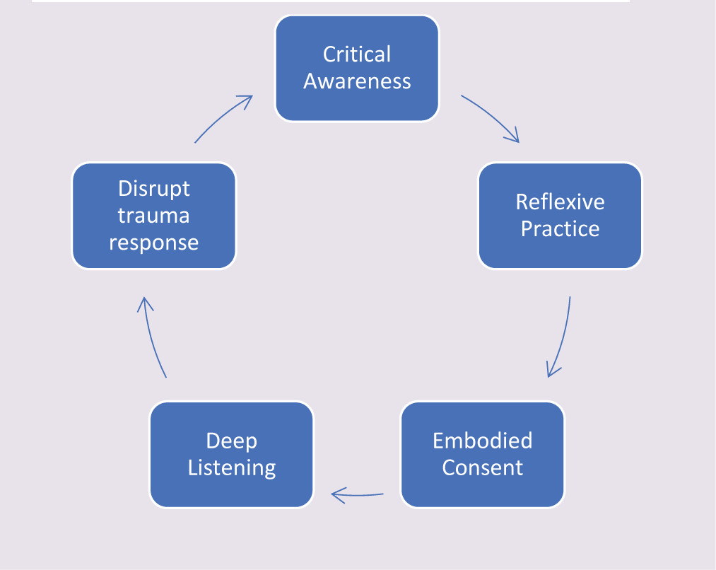 The working principles of TDC are Critical awareness, Reflexive practice, Embodied consent, Deep listening, and Disrupting trauma (CREDD; Figure 1), which stipulates the healthcare provider to: