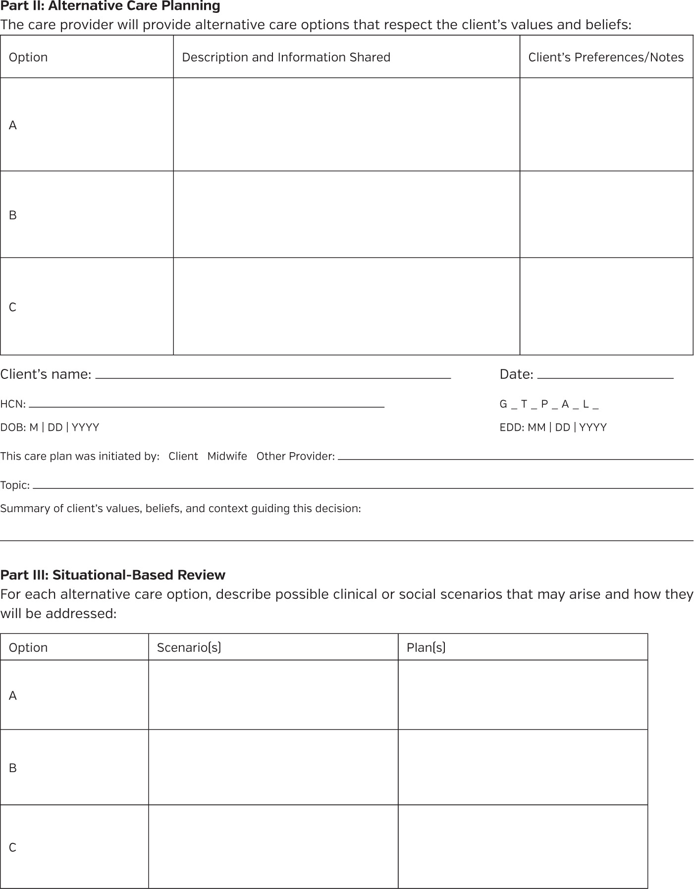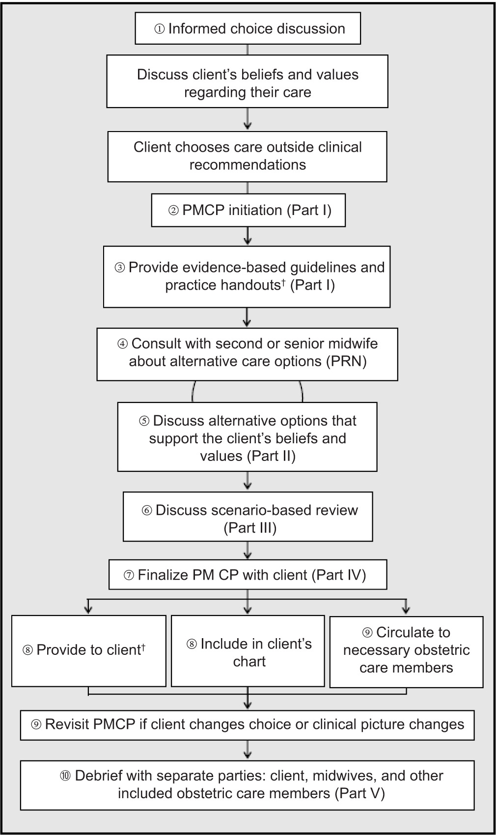 Moreover, the PMCP’s effectiveness as a communication tool is limited in settings where other care providers or institutions do not recognize or engage with it. While system-wide uptake could enhance interprofessional collaboration and continuity of care, the PMCP was developed first and foremost to strengthen midwifery practice and can function effectively as an internal guide and standalone document for midwives.27,30 Even without broader adoption, including the PMCP in the client’s chart can support clarity, documentation, and respectful care planning. In summary, the PMCP offers a structured and ethically grounded approach to navigating informed choice in midwifery care, addressing the challenges midwives face when clients choose care that diverges from recommendations. Its successful implementation does not depend on collective adoption across the healthcare system, though such uptake would be a welcome enhancement.6,11,31,33