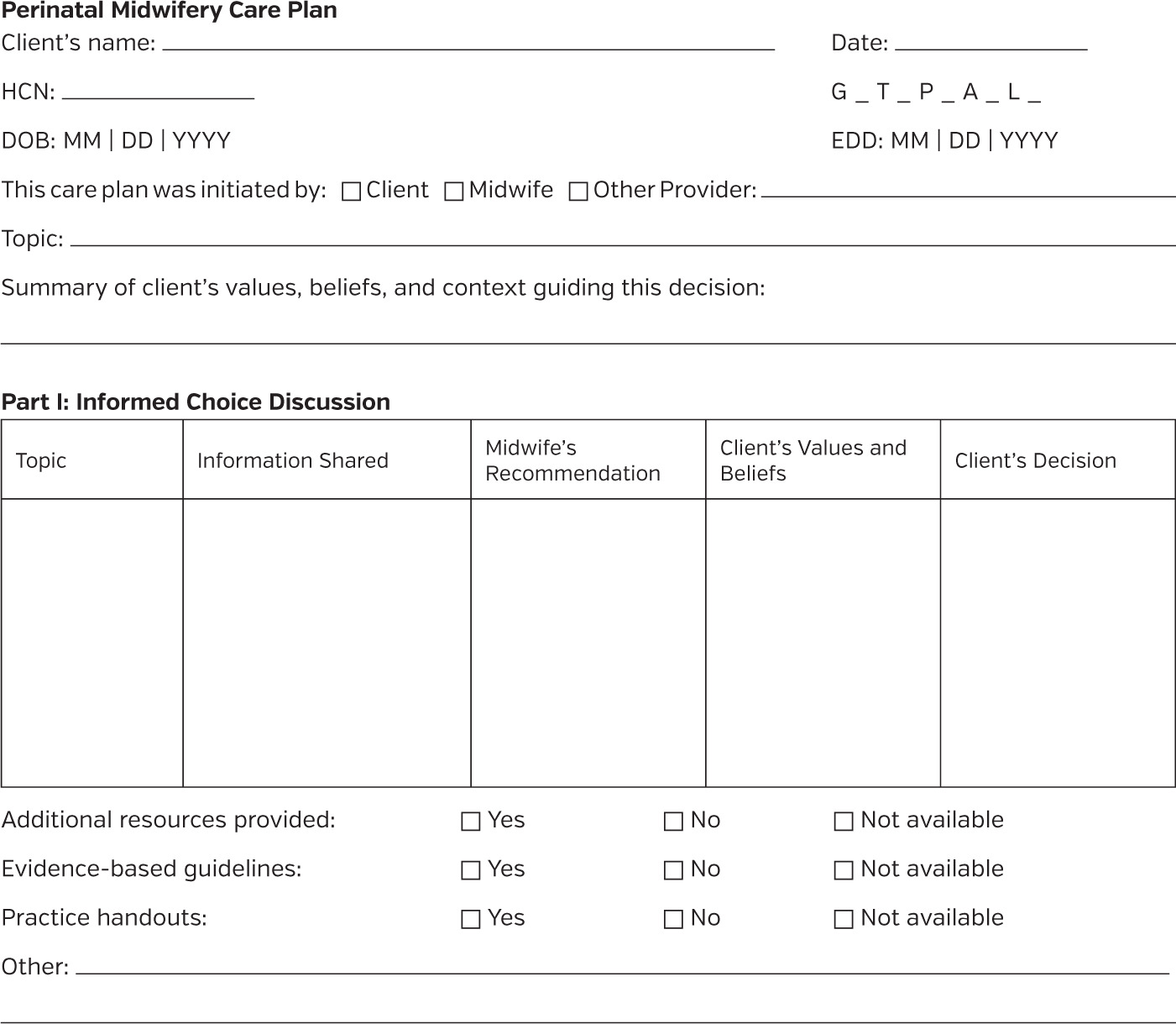 Canadian midwifery is grounded in informed choice, yet midwives often face uncertainty when clients choose care outside clinical recommendations. These moments expose clients and midwives to risks of coercion, fractured communication, and legal or professional scrutiny. In spite of this, there is no explicit framework or tool to guide midwives through the ethical, relational, and systemic complexities of such decisions. This article introduces the Perinatal Midwifery Care Plan—a framework and documentation tool developed to uphold relational autonomy. The care plan supports individualized care planning through structured dialogue, collaborative decision-making, and consistent documentation, ultimately to reduce provider stress, enhance interprofessional communication, and protect client agency. We situate the care plan within Canadian midwifery values and review its theoretical foundations, strengths, and limitations. As midwifery care evolves, the care plan offers a practical mechanism to support ethical practice, while future research is needed to explore its application across diverse clinical and educational contexts.