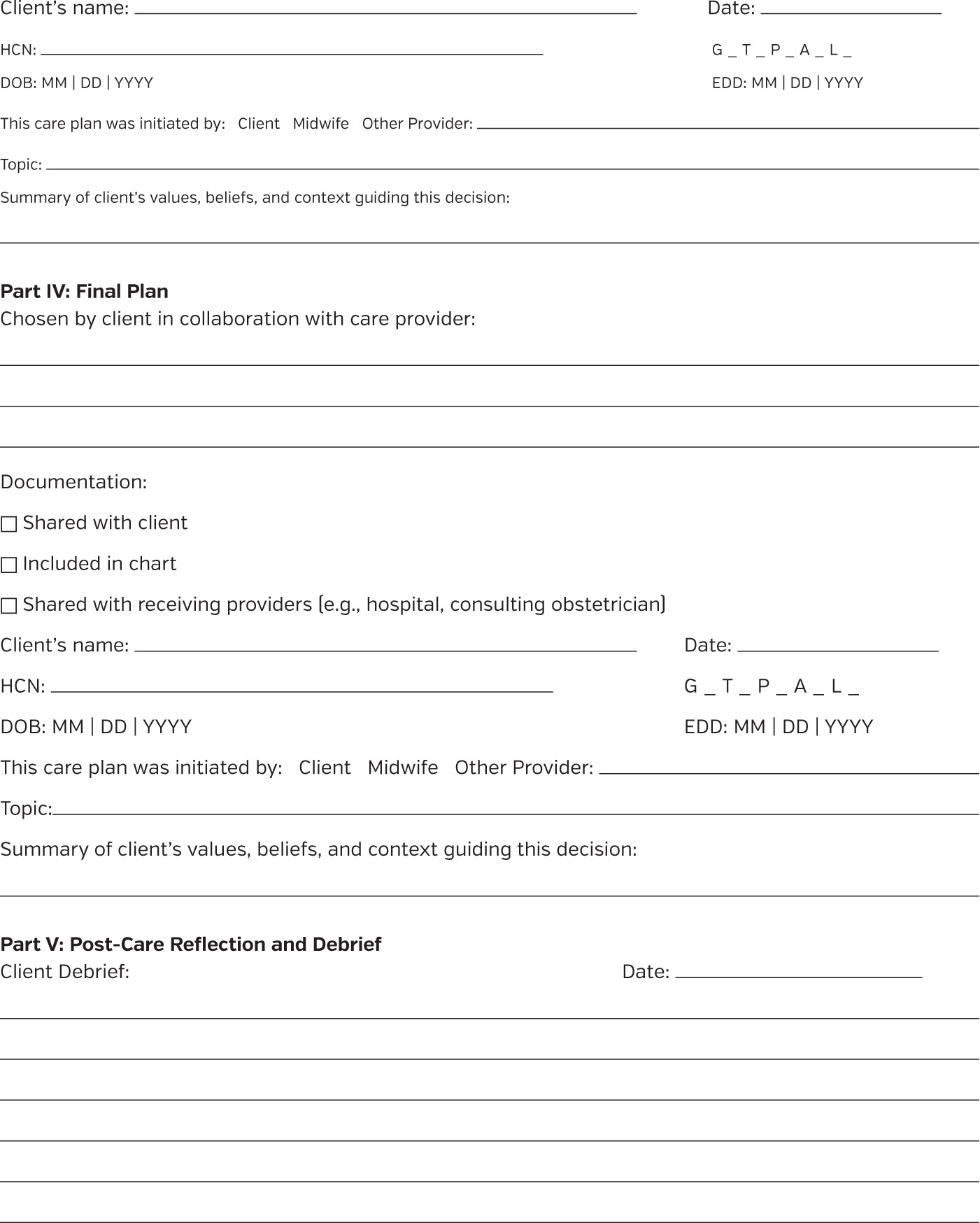 The PMCP also addresses the emotional and cognitive demands of supporting informed choice in ethically complex scenarios.11,12,25,26 Its structure encourages midwives to consult colleagues, engage in self-reflection, and proactively plan for clinical contingencies, all of which can reduce feelings of isolation or moral distress.26–28 Furthermore, by providing a clear record of the client’s values and preferences, the PMCP facilitates interprofessional communication and improves the likelihood of continuity during consultations, transfer of care, or shared care.11,27,29,30