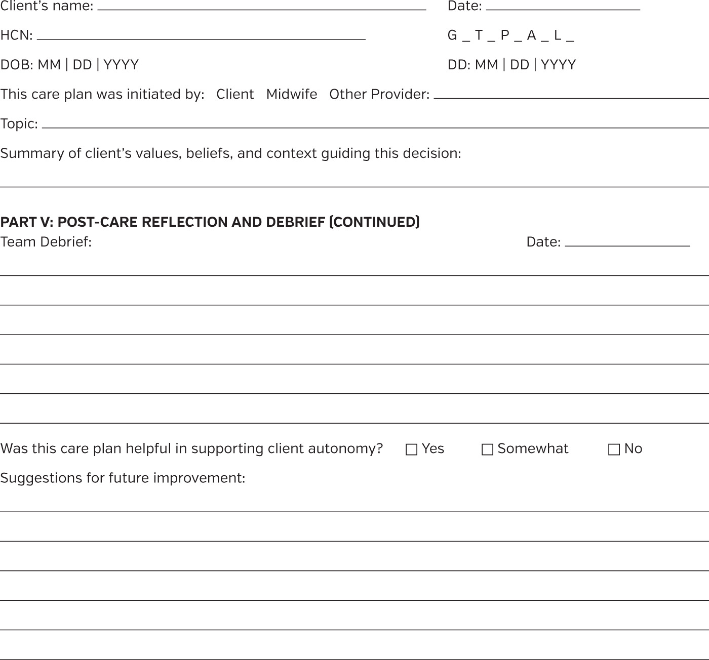 Step 10: Post-care debriefing. After the care plan has been implemented, the midwife facilitates structured and separate debriefs with the client, other midwives, and interprofessional team members in Part V. These discussions provide space for reflection, reinforce relational learning, and support continuous improvement in care delivery.